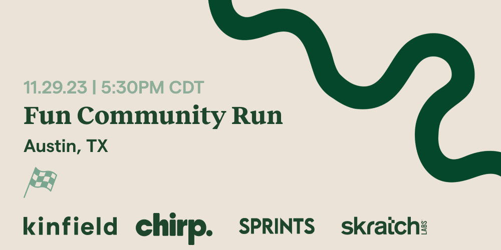 Lace up those running shoes and join Kinfield, Chirp, Sprints, and Skratch for a 4mi run around Austin! We'll have treats to share from all brand partners and a raffle you won't want to miss. See you there.